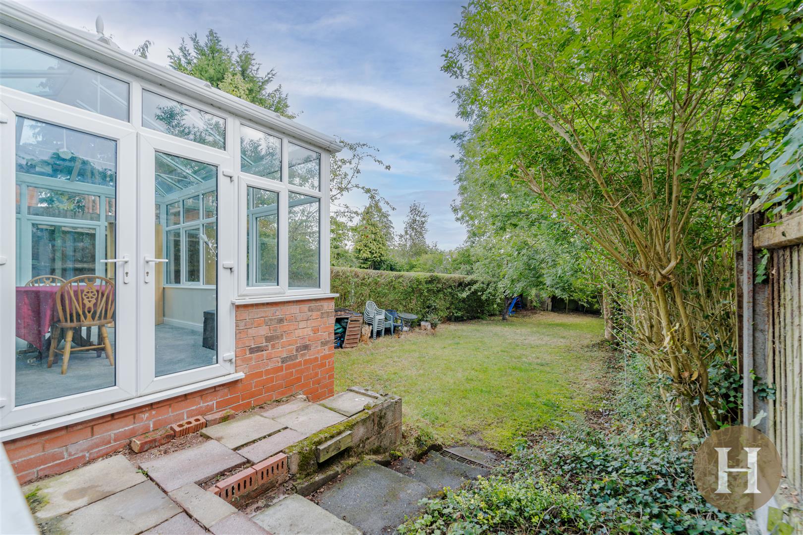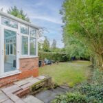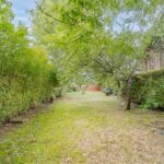 Large private rear garden predominantly laid to lawn with a range of mature shrubs and trees.