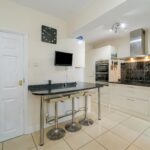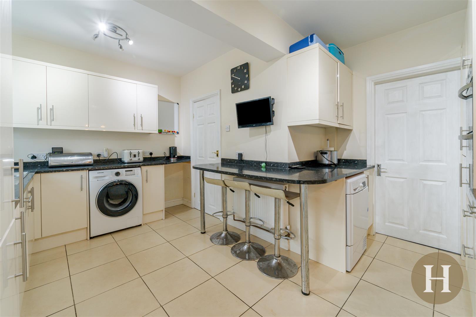 Modern fitted kitchen boasting a range of base and wall units. Integrated appliances, hob and extractor over. Fitted breakfast bar, central heating radiator, ceiling light points and access to the conservatory.