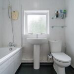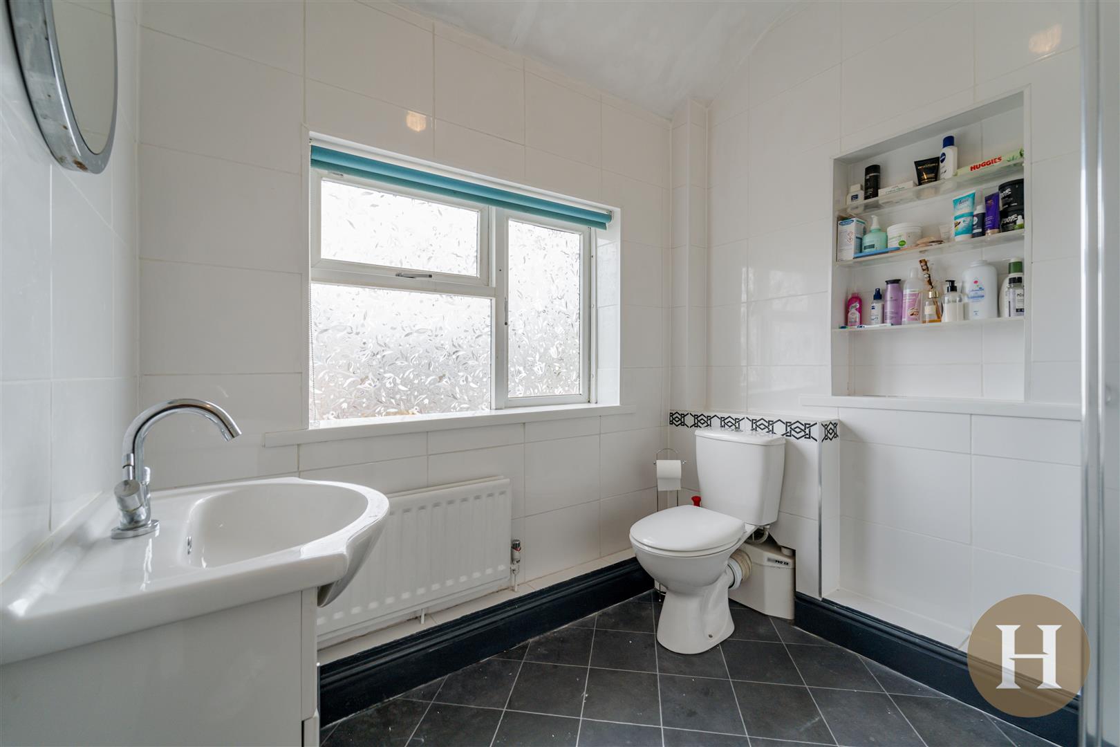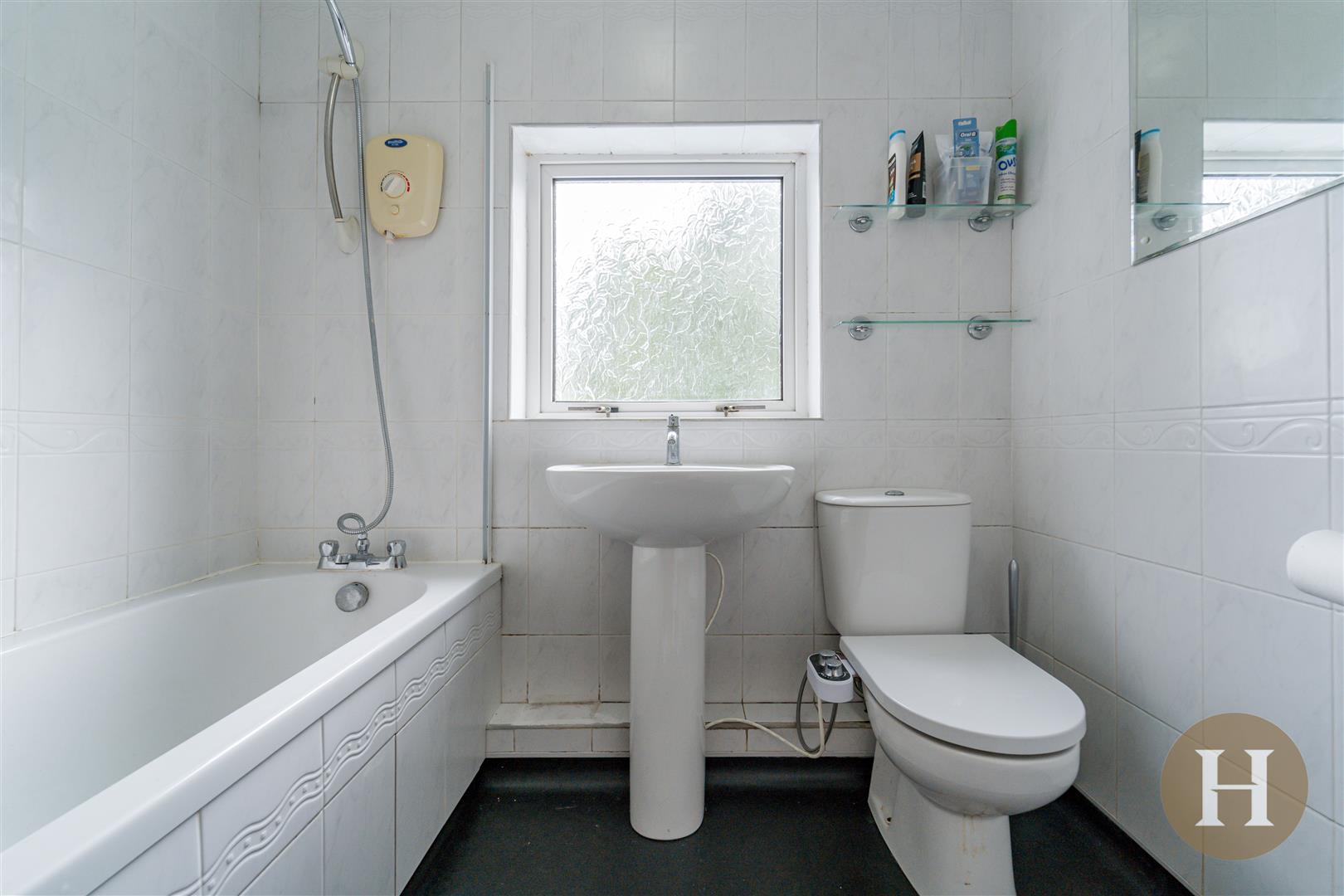 Bathroom with shower over bath, low level flush WC and hand wash basin. Opaque window to rear elevation, towel radiator and tiled walls.