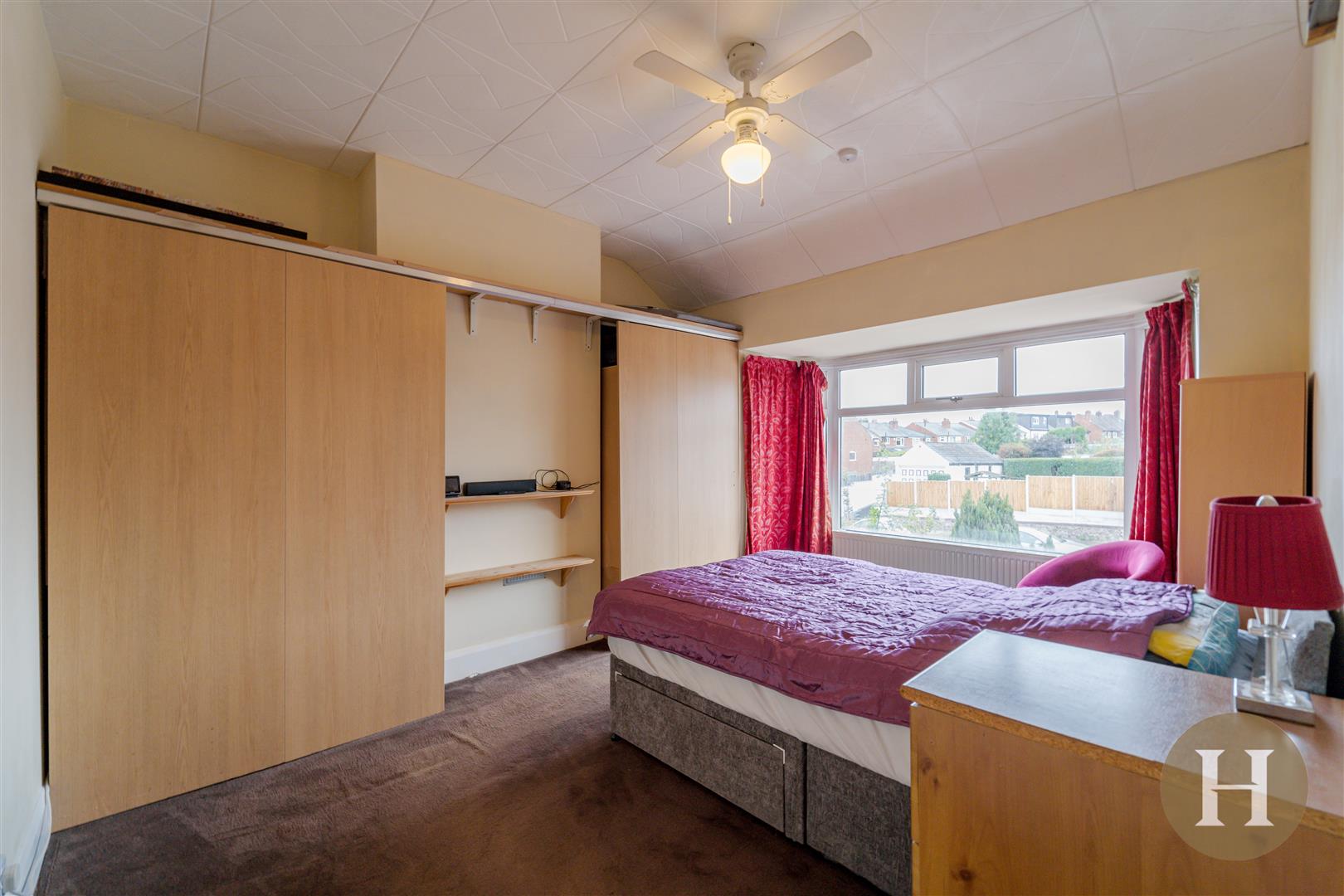 Master bedroom with sliding fitted wardrobes, bay window to front elevation, carpeted flooring and central heating radiator.