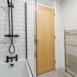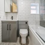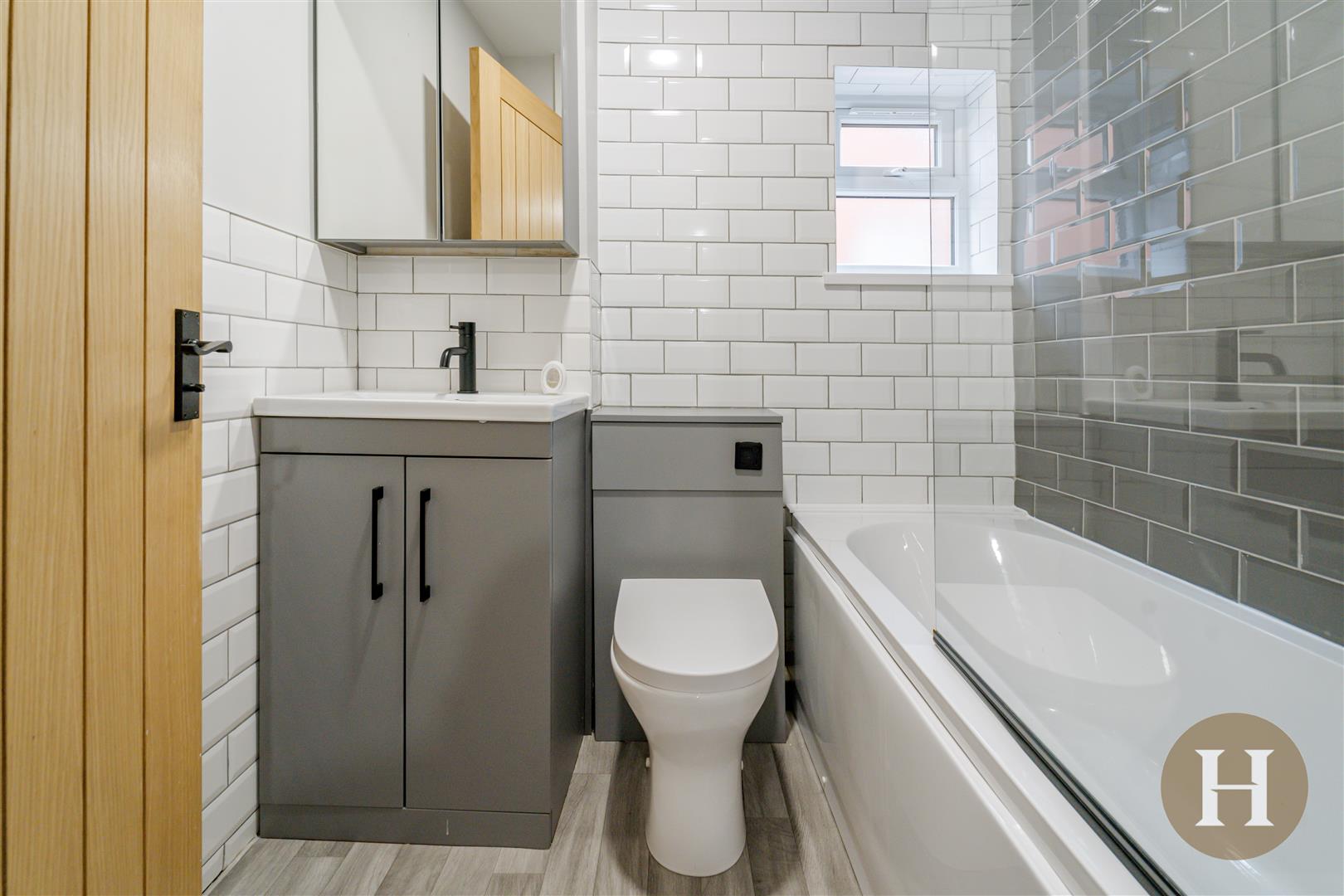Modern family bathroom, comprising fitted bath and mains shower over. Concealed low level flush WC, vanity unit and mirrored medicine cabinet. Obscure glazed window to the side elevation, ceiling light point and tiled walls.