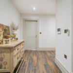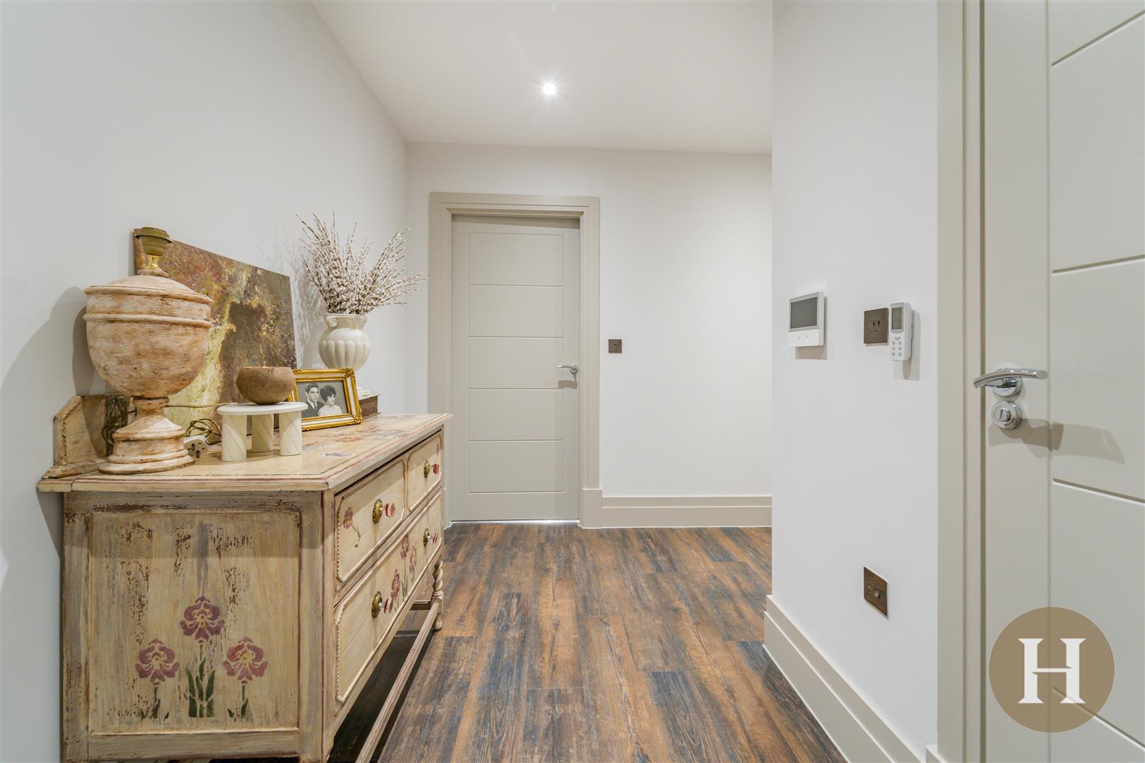 Spacious and welcoming hallway with touch screen video entry system, thermostat, spotlights to ceiling and storage cupboard, complete with hanging rails.