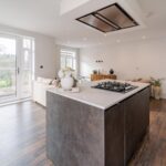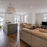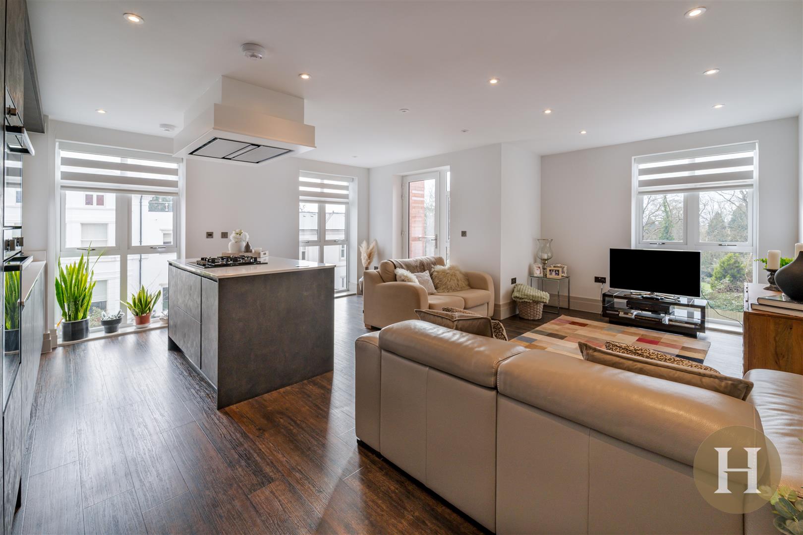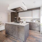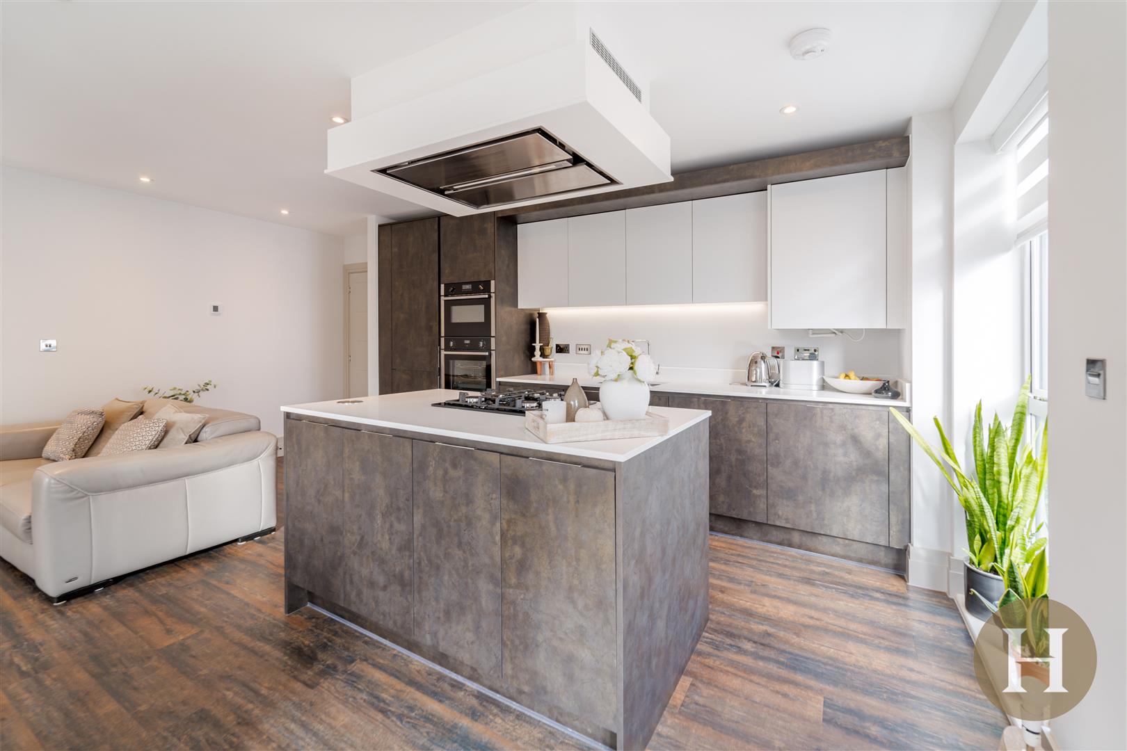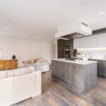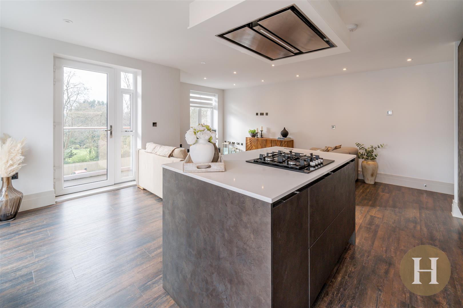 Individually designed kitchen featuring sleek handle less cabinetry and soft close drawers. Premium quartz worktops with upstand to kitchens, a range of integrated appliances throughout including Neff gas hob, single oven and combination microwave oven. Bespoke kitchen island, with pop up electric socket and offering further storage.