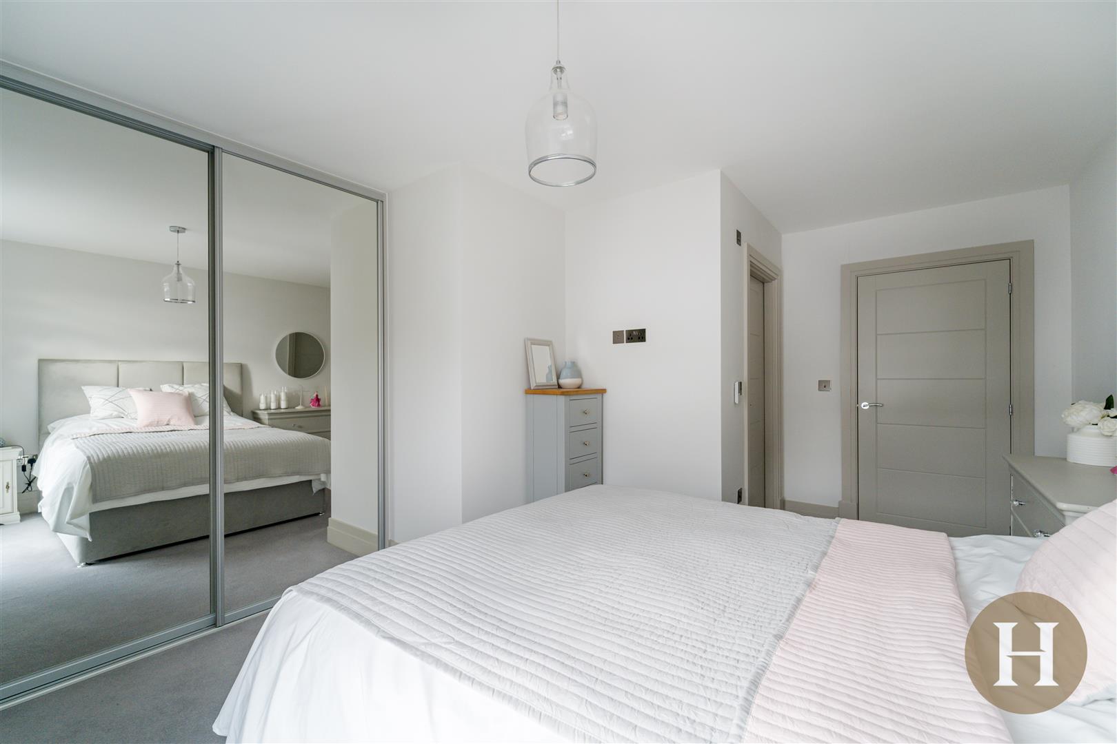 Spacious master bedroom, boasting bespoke fitted wardrobes with mirrored sliding doors and access to en suite. Double glazed window, complete with fitted blind. Ceiling light point and carpeted flooring.