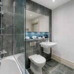 Contemporary white Villeroy & Boch sanitaryware with polished chrome fittings by Hansgrohe. Bespoke fitted mirrored cabinet with shelving and lighting. Floor to ceiling ceramic tiling, multi-rail chrome heated towel rail, low level flush WC and shower over bath.