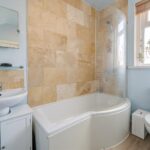 Partially tiled bathroom suite comprising bath with shower over, low level flush WC, hand wash basin and towel radiator. Opaque window to the front elevation and ceiling light point.