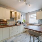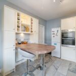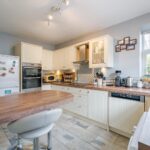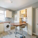 Fitted kitchen with a range of base and wall units including integrated oven, dishwasher and plumbing for washing machine. Convenient breakfast bar, access to cellar and housing boiler. Window to front elevation and ceiling light point.