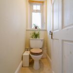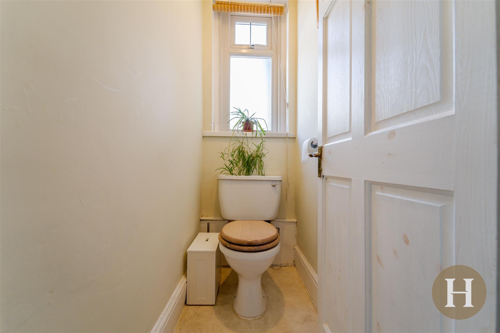 Low level flush WC, opaque window to the front elevation and ceiling light point.