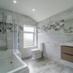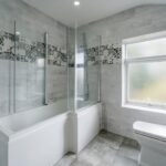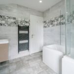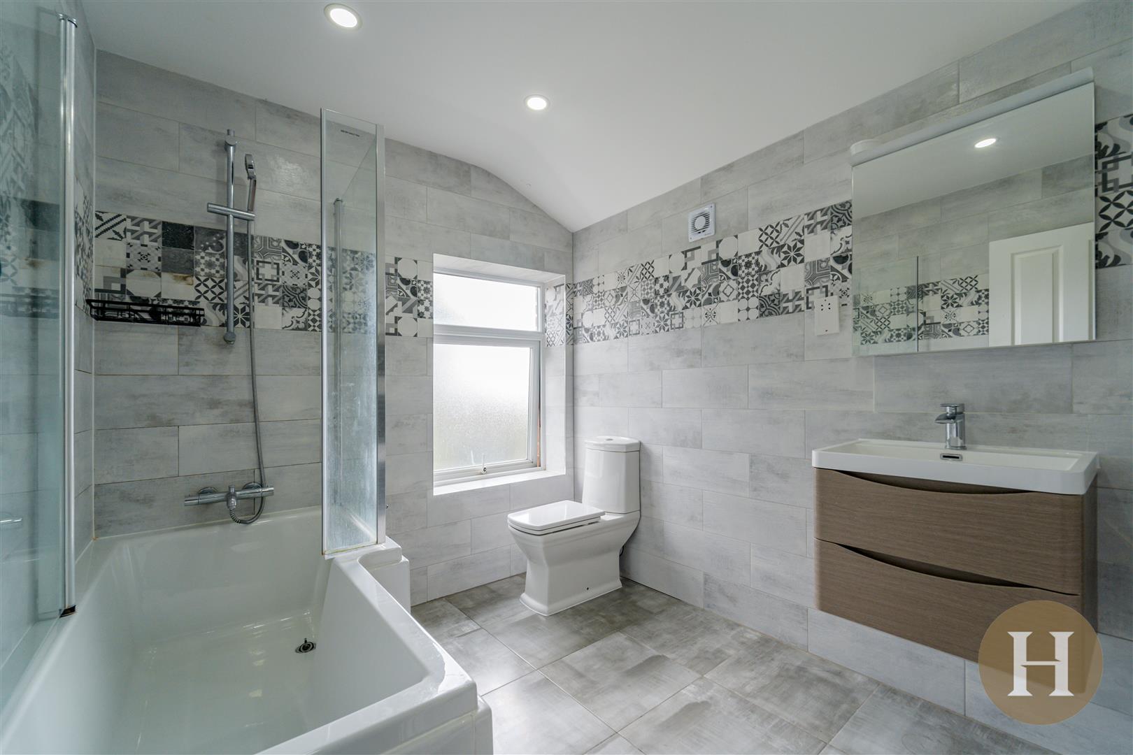 'P' shaped bath with shower over, floating vanity and low level WC, wall tiling, towel radiator, ceiling spotlights and double glazed window to rear.
