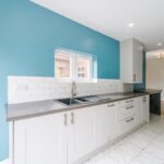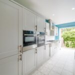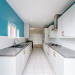 Sink unit and drainer, range of base and wall units, contrasting worktop, five ring gas hob, single door oven, microwave, integrated dishwasher, fridge/freezer, double glazed window to side and patio doors to the rear garden.