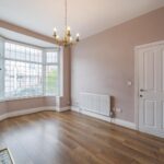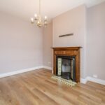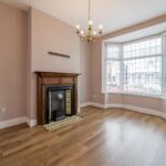 Feature fireplace with ornate tiling, central heating radiator, laminate flooring, ceiling light point, power points and double glazed bay window to front.