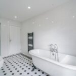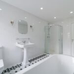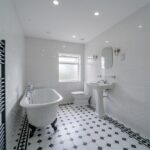 A modern suite with freestanding bath with claw feet, corner shower cubicle, wash hand basin, low level WC, towel radiator and double glazed window to rear.