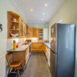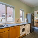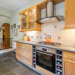 Fitted kitchen with a range of base and wall units, sink and drainer unit. Plumbing for utilities along with integrated dishwasher. Five ring gas hob, extractor over and under unit lighting. Tiled splashbacks, central heating radiator, spotlights and rear door.