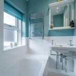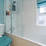 Partially tiled bathroom suite with low level flush WC, shower over bath and hand wash basin. Opaque window to the side elevation, ceiling spotlights and towel radiator.