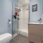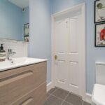 Partially tiled ensuite with walk in shower cubicle, including shower attachment. Vanity unit, low level flush WC and towel radiator.