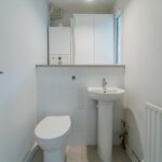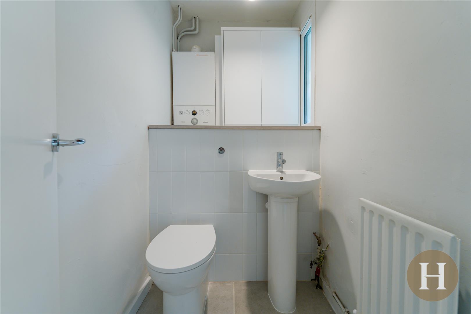 Low level, concealed cistern WC and hand wash basin. Tiled flooring, ceiling light point and gas central heating radiator. Obscure glazed window to front elevation, storage cupboard and housing brand new boiler.