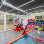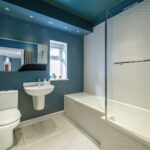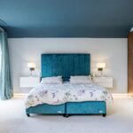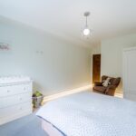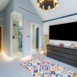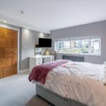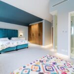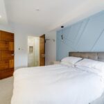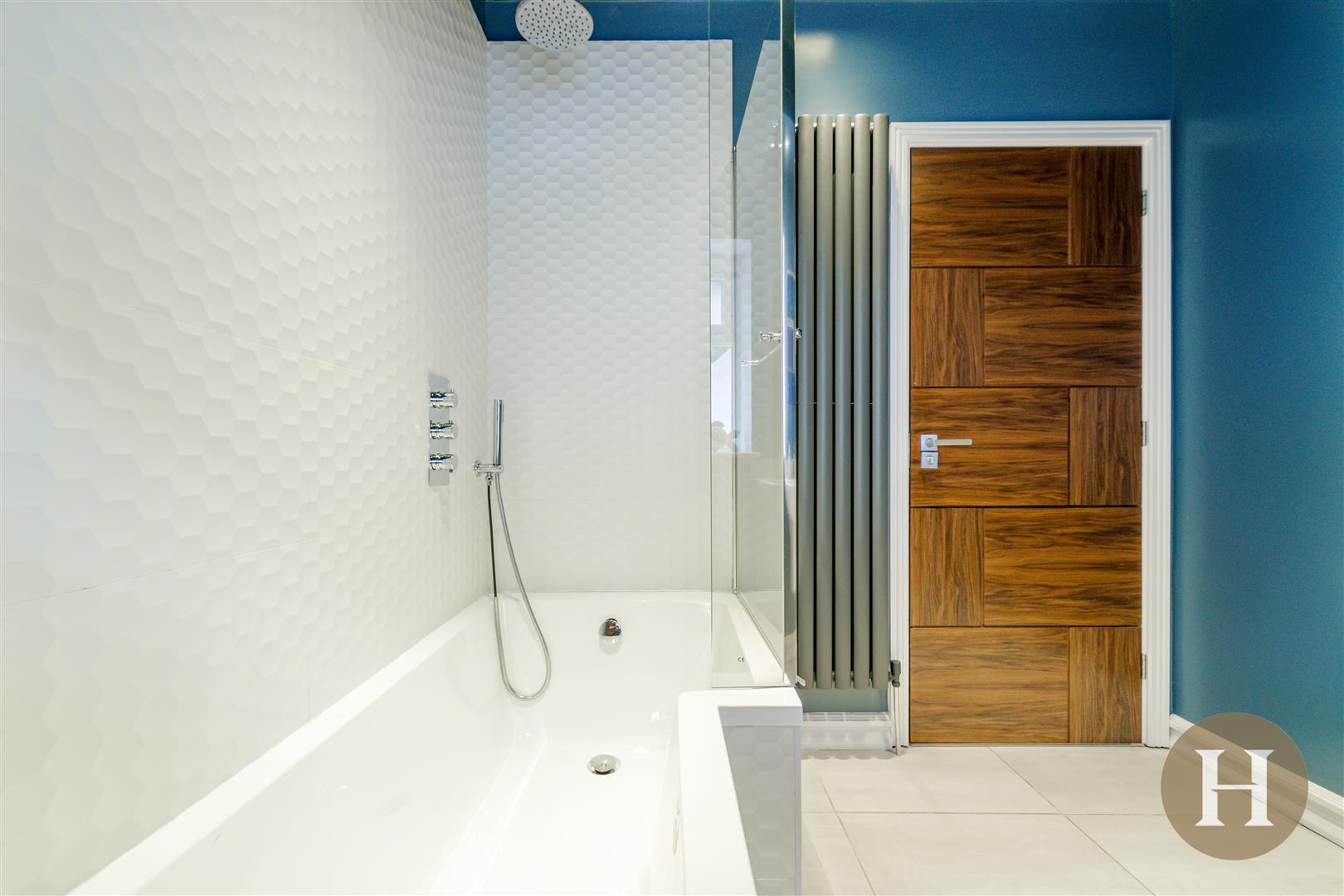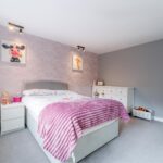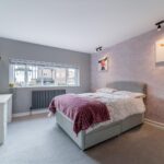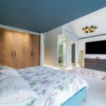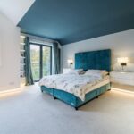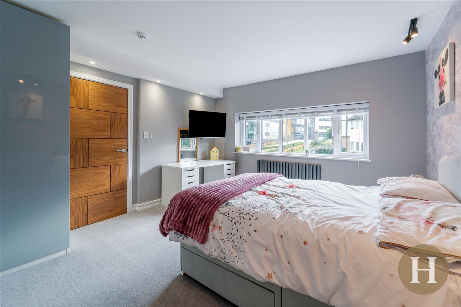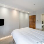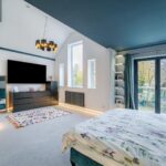 An extensive master suite, boasting three windows to the rear elevation, bi-fold Juliet balcony doors and tall ceiling. Fitted wardrobes, floating beside tables, wall and ceiling LED lighting and feature ceiling light point.