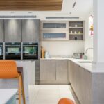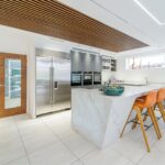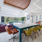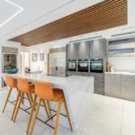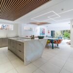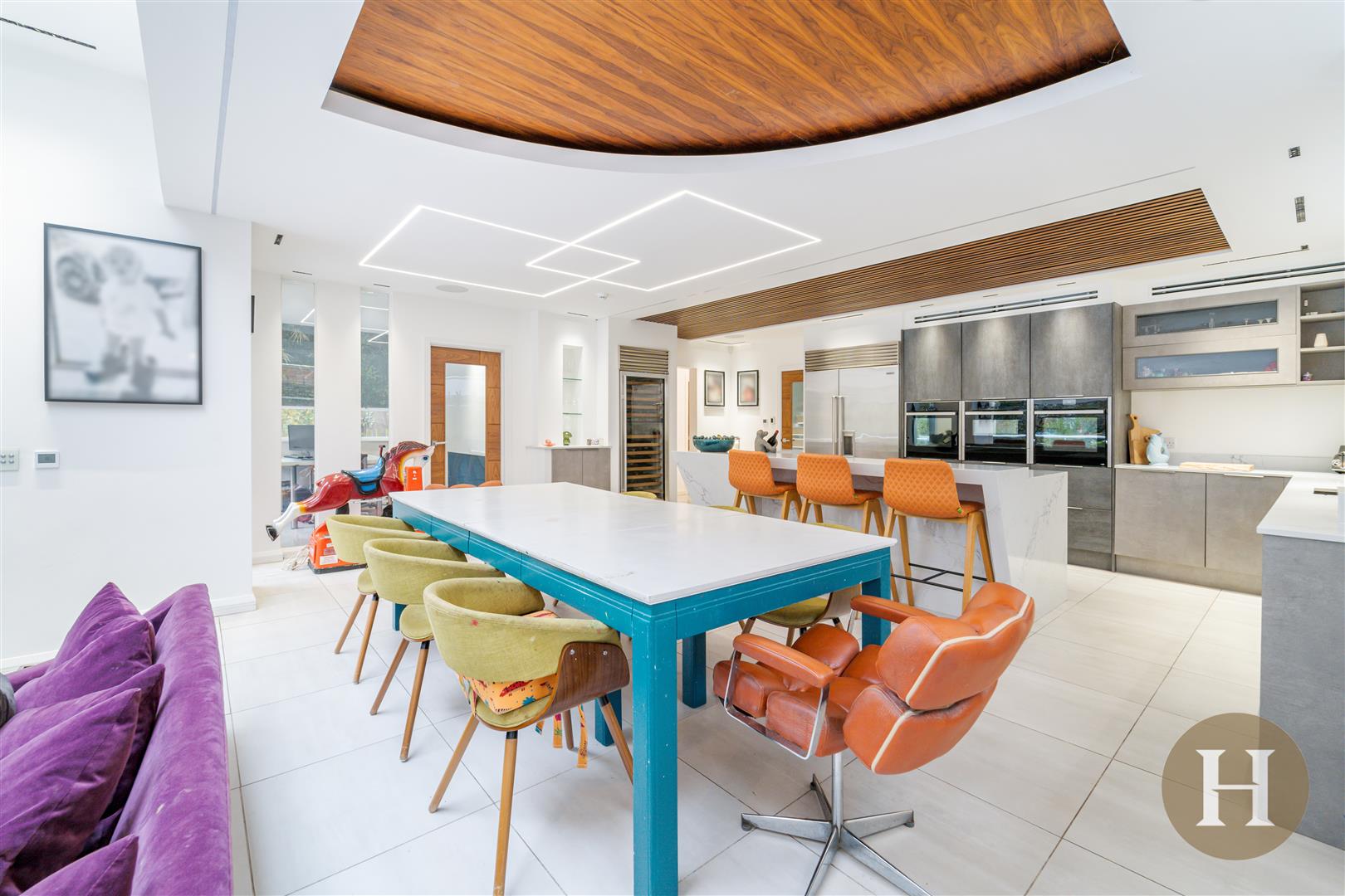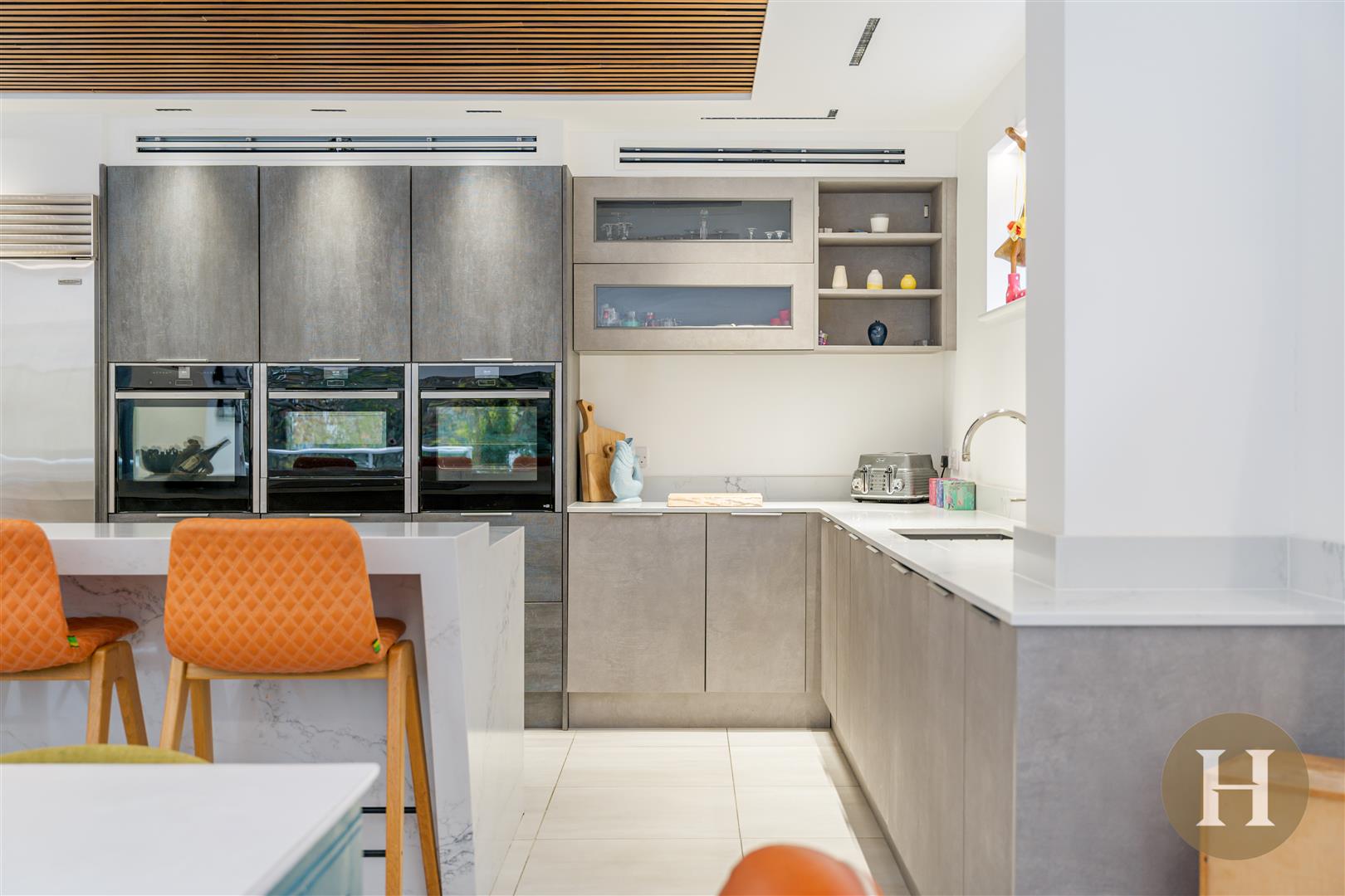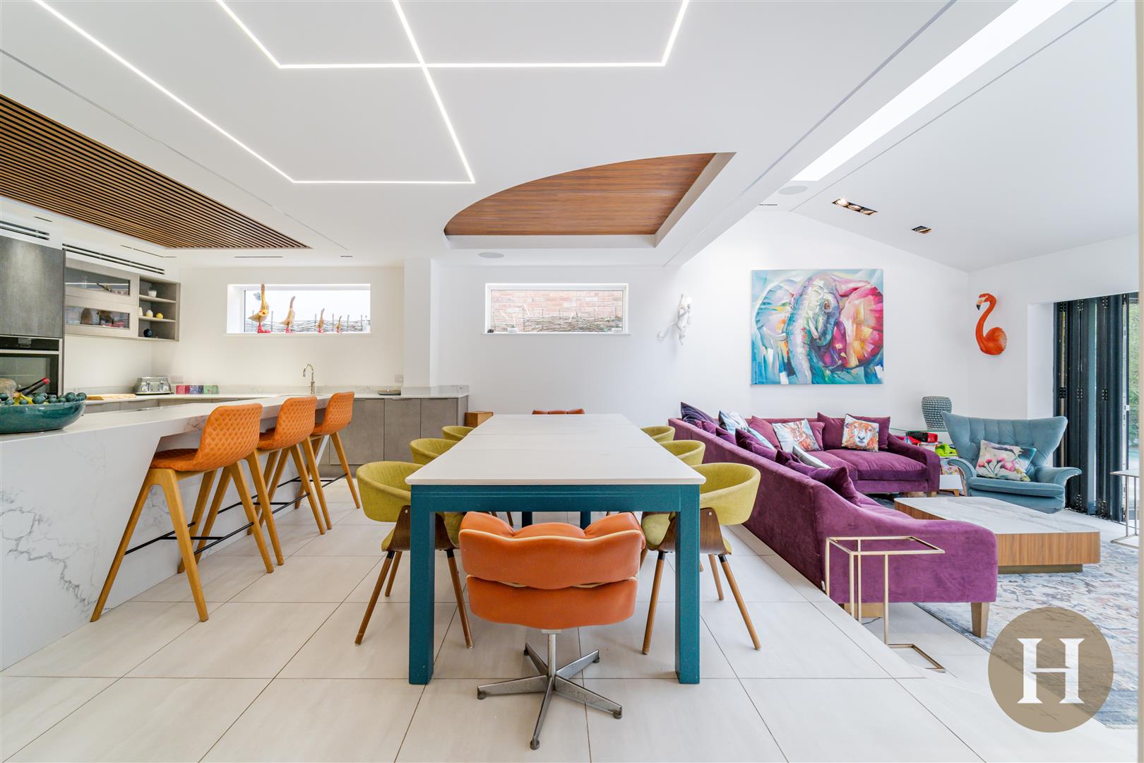 Modern open plan kitchen diner, boasting a bespoke quartz island, complete with undercounter storage and breakfast bar. Feature LED lighting set within the designer ceiling, including sound system. Built in high end appliances, including wine fridge, fridge freezer and oven. Tiled flooring offering underfloor heating, integrated dishwasher and inset sink with boiling water tap.