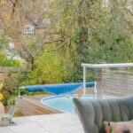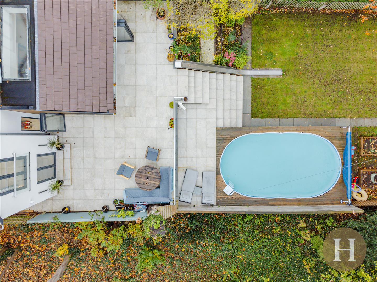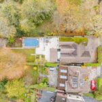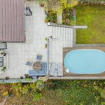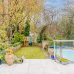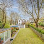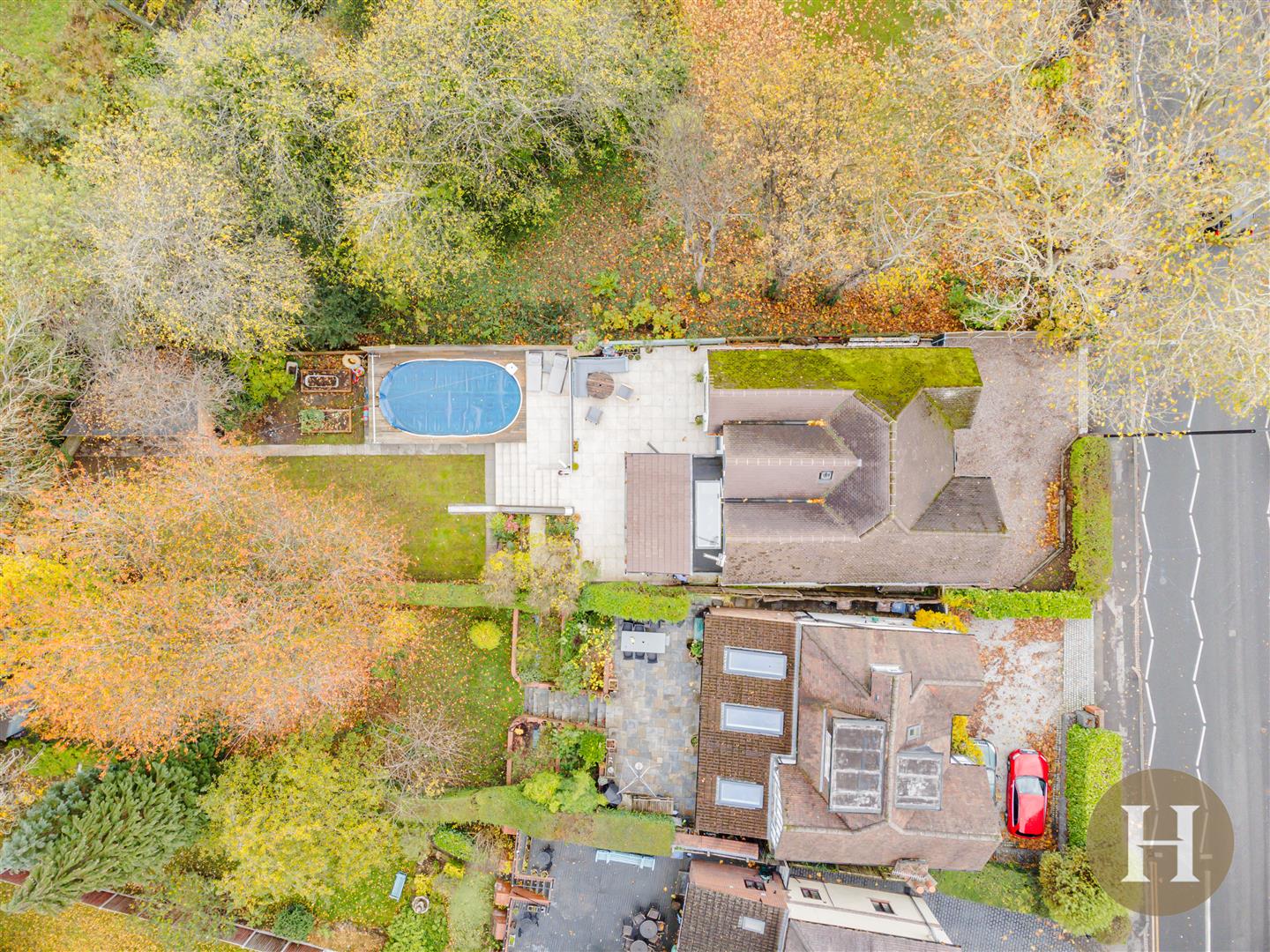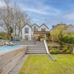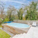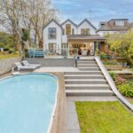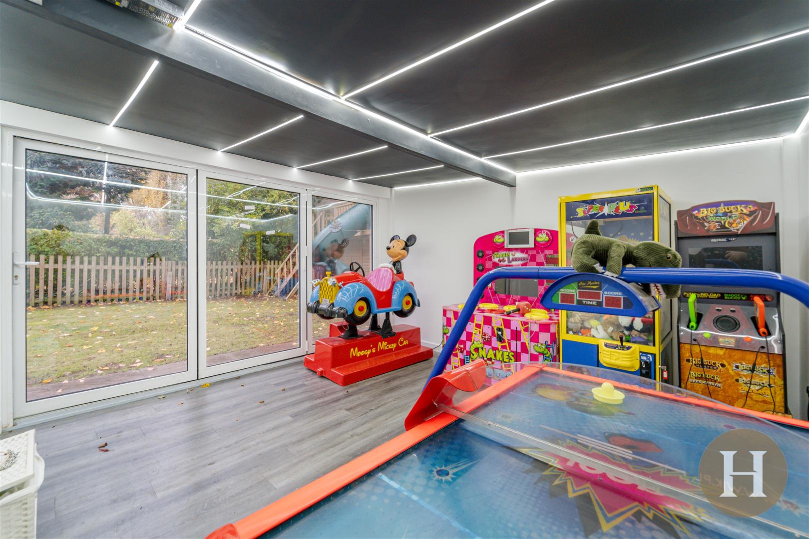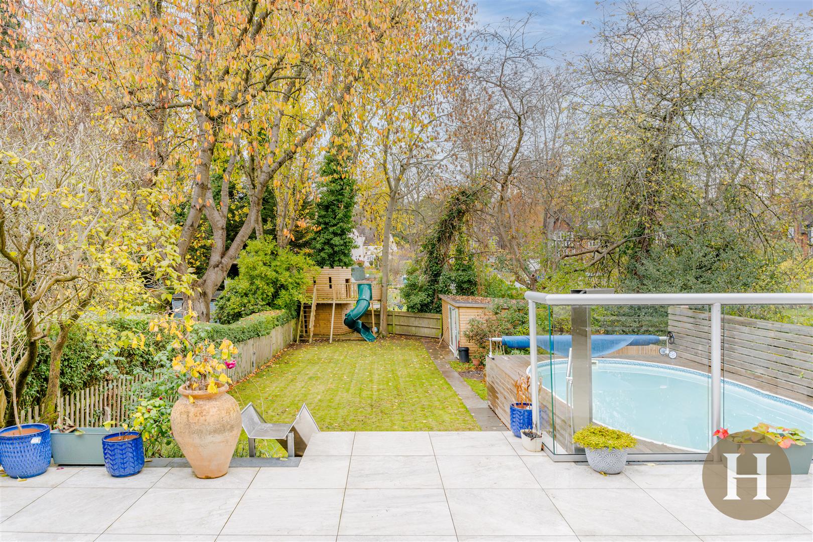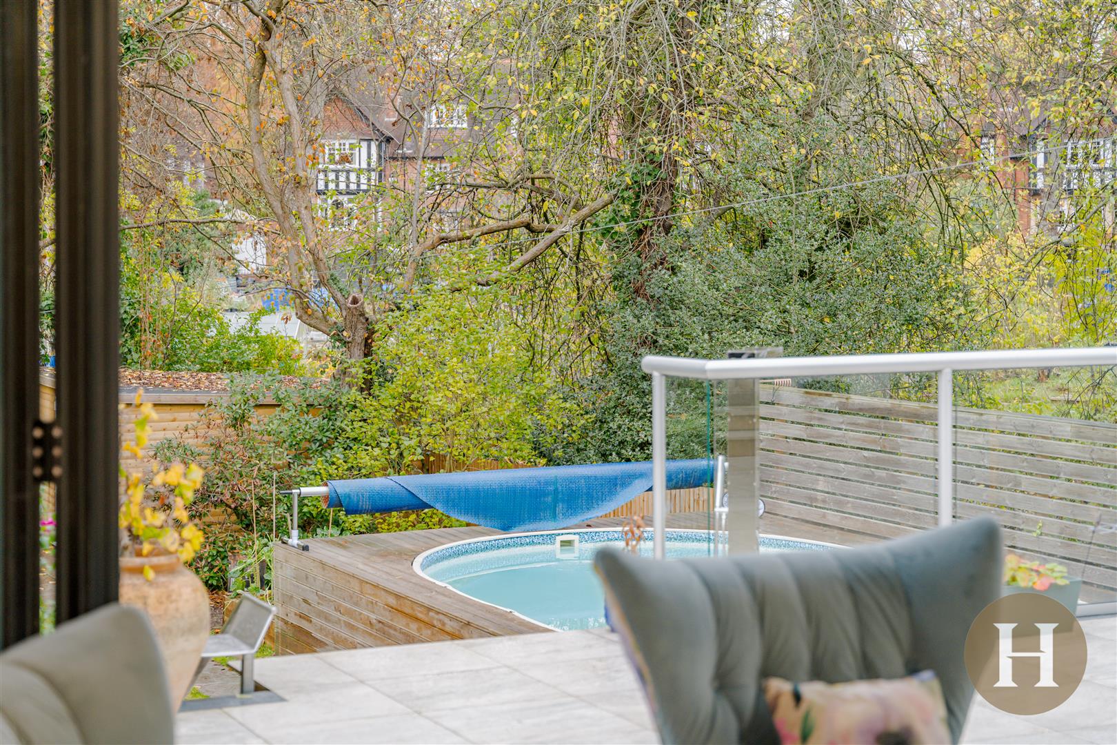 Extensive garden, laid to lawn and boasting significant patio area. Wrap around tiled patio, steps down to additional seating area and above ground pool. To the rear of the garden is an extensive garden room and storage area.