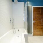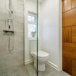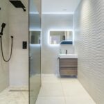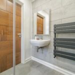 Modern bathroom with walk in mains shower and additional attachment, low level flush WC, vanity unit and LED backlit mirror. Tiled walls and flooring, along with recessed LED lighting, central heating radiator, further benefitting from floor to ceiling glazed window.