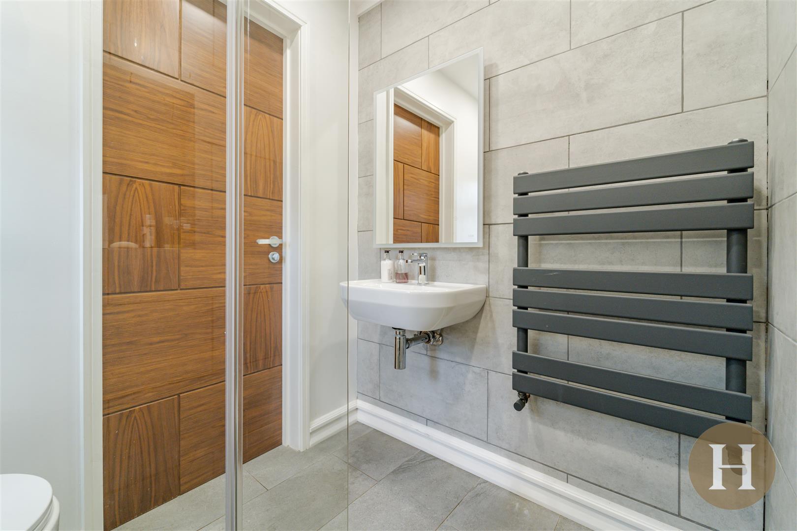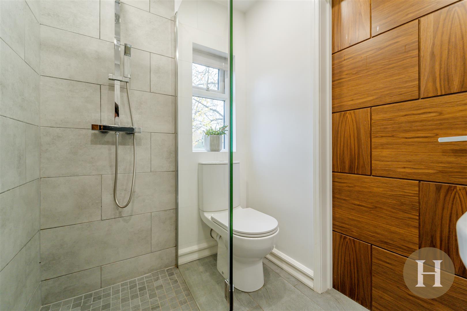 Fully tiled ensuite shower room with window to side elevation. Walk in mains shower with additional attachment, low level flush WC, hand wash basin and radiator.