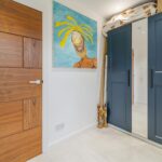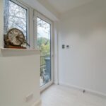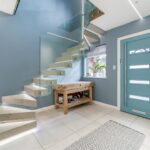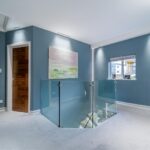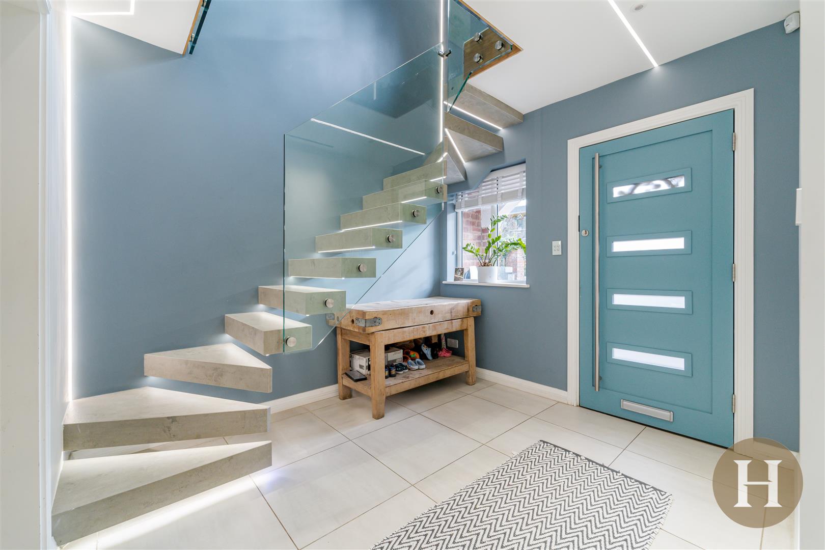 Floating staircase to first floor accommodation with down lighting, glass balustrade, LED lighting and tiled flooring. Underfloor heating, handmade front door and double glazed window to front elevation.