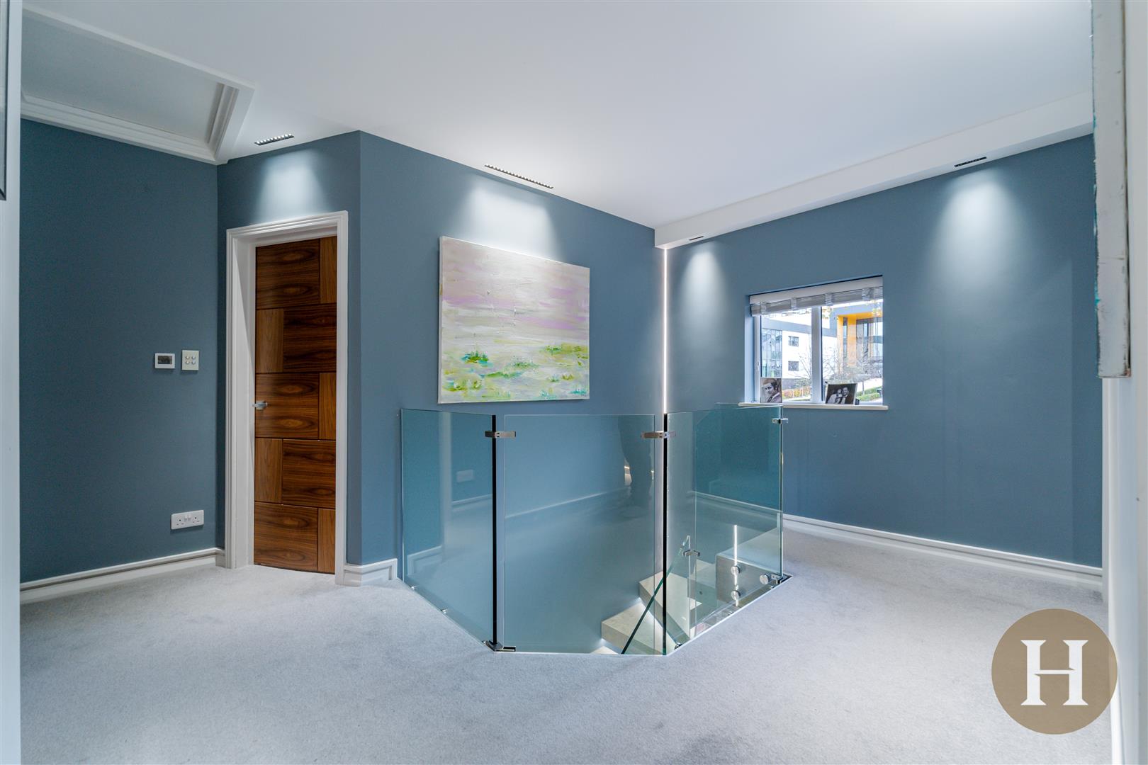 Spacious and open landing, with glass balustrade, double glazed window to the front elevation. Wall and ceiling LED lighting and central heating radiator.
