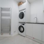 Plumbing for appliances, wall and ceiling LED lighting, a range of base and wall units. Towel radiator, sink and drainer unit along with tiled flooring.