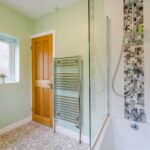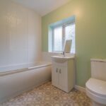 Partially tiled bathroom suite, with shower over bath, low level flush WC and vanity unit. Ceiling light point, opaque window to the rear elevation and towel radiator.