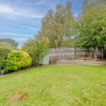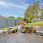 Paved patio area leading to garden predominantly laid to lawn.