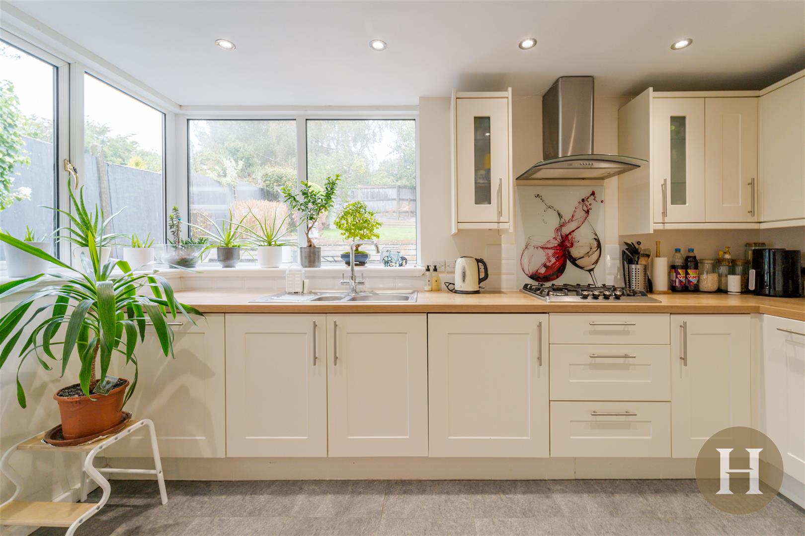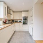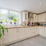 Modern fitted kitchen with a range of base and wall units, integrated oven, dishwasher and gas hob with extractor over. Dual aspect windows to the side and rear elevation, along with rear patio door. Central heating radiator and ceiling spotlights.