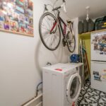 Low level flush WC, vanity unit and plumbing for utilities. Space for fridge freezer and storage.
