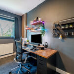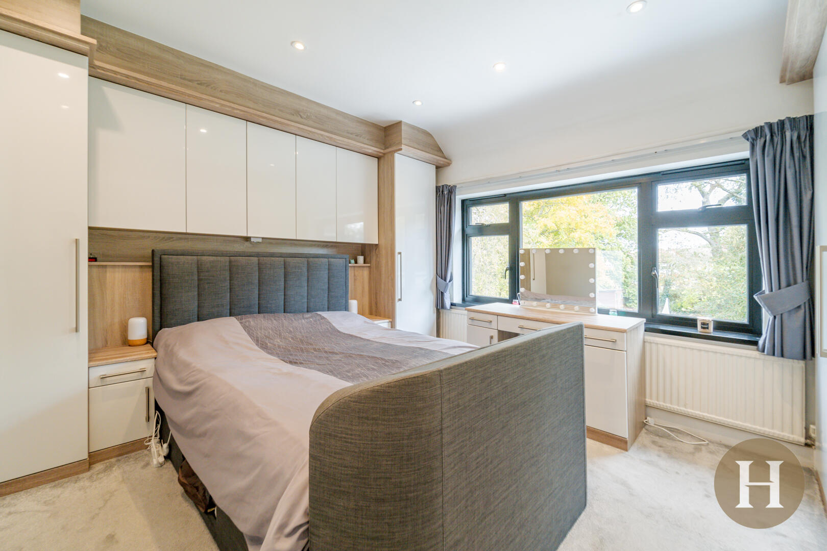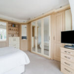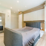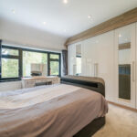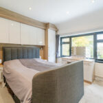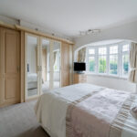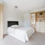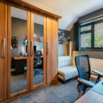 Master bedroom with carpeted flooring, window to rear elevation, gas central heating radiator and bespoke fitted wardrobes.