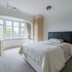 Double bedroom with carpeted flooring, bay window to front elevation, gas central heating radiator and fitted wardrobes.