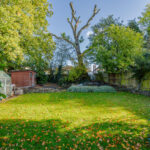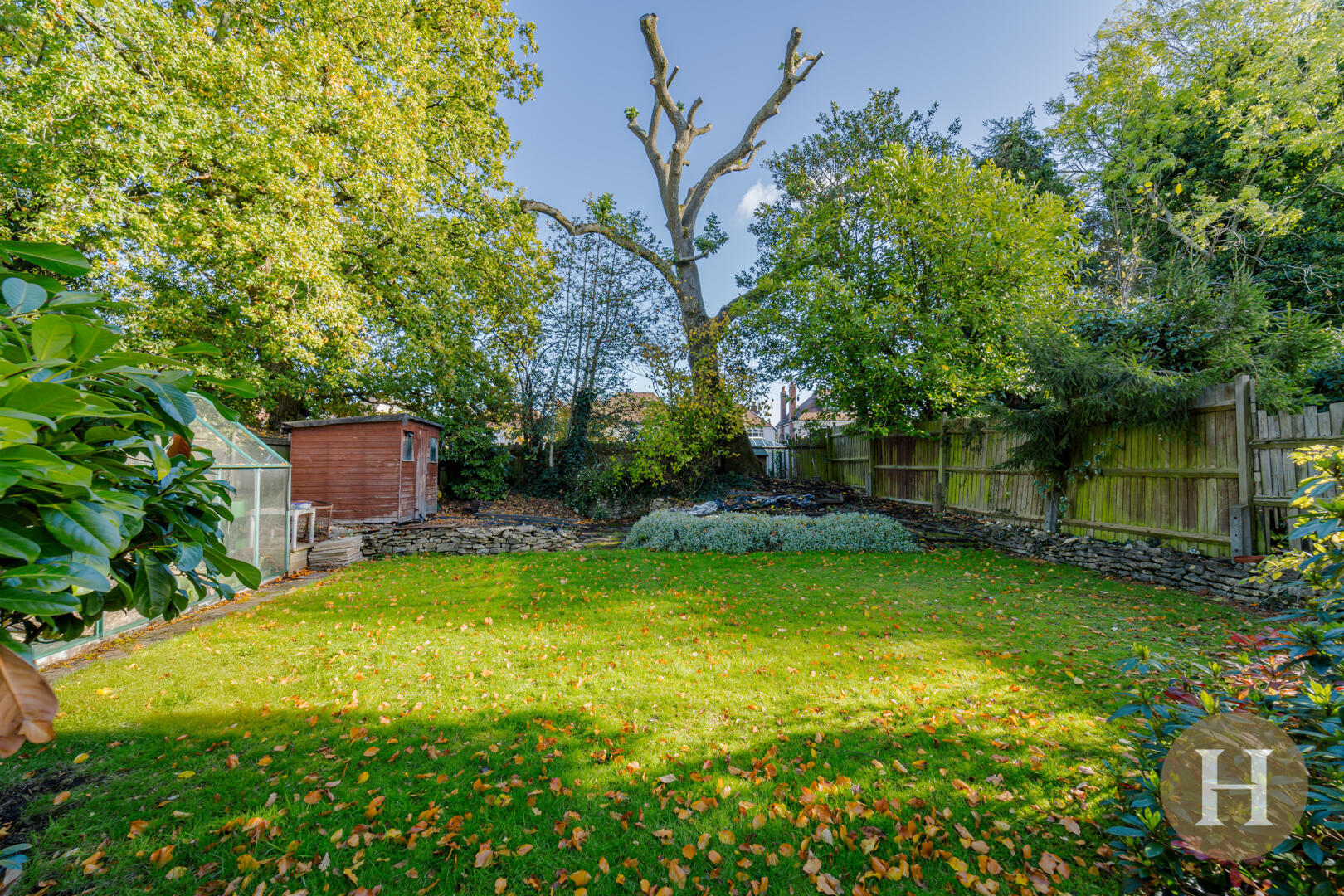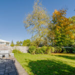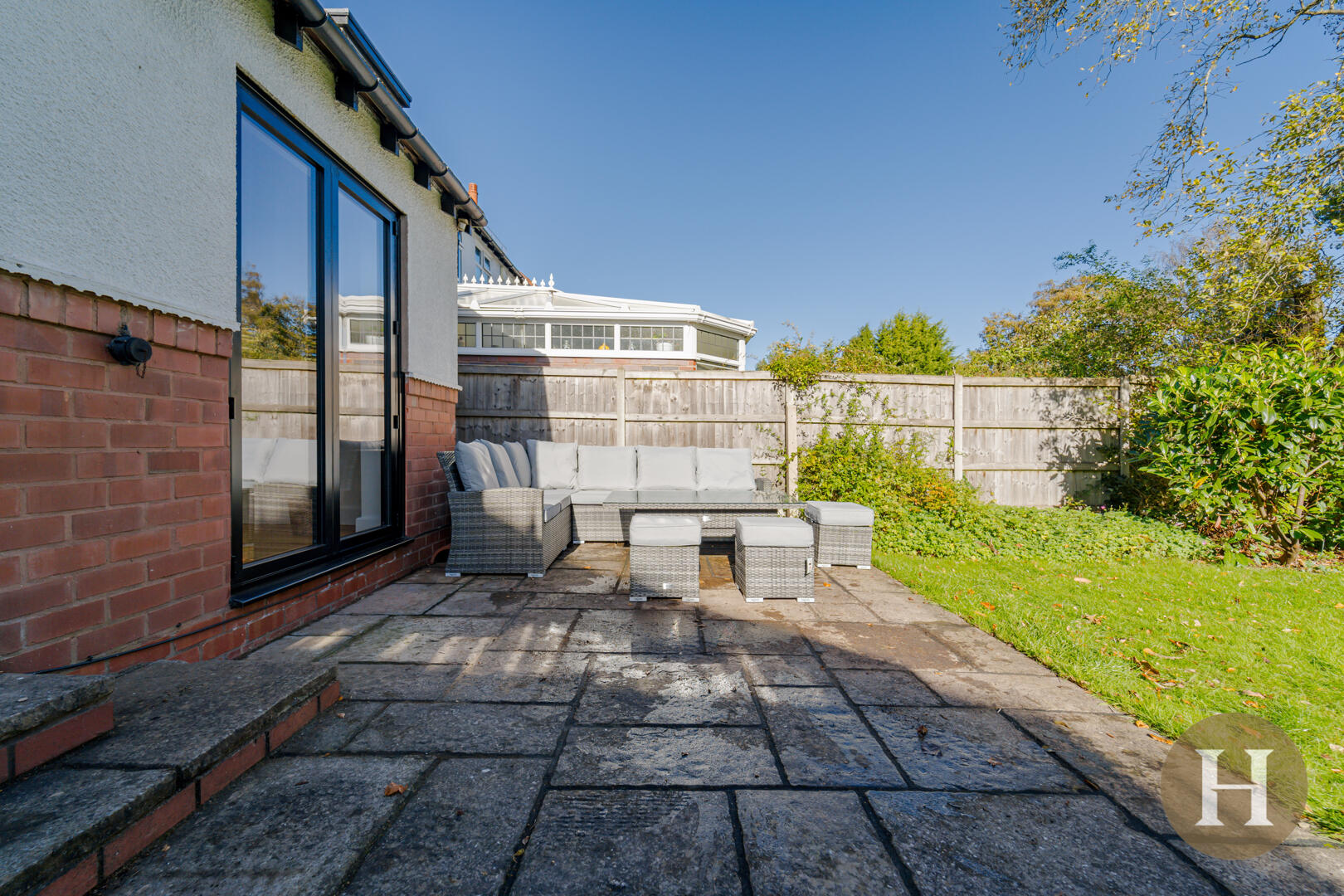 Slabbed patio area, large private garden with fenced boundaries and predominantly laid to lawn.