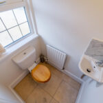 Low level flush WC, hand wash basin, partially tiled walls