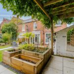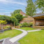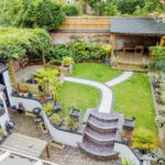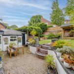 A beautifully maintained tiered rear garden with patio area and steps leading to lawn, with decorative flowerbeds, mature bushes and plants. Boasting wooden pagoda and seating area.