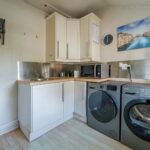 Double glazed window to the side elevation comprising additional wall and base units, work surfaces with stainless steel sink and splash back. Plumbing for utilities and central heating radiator.