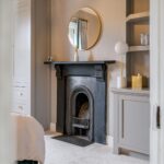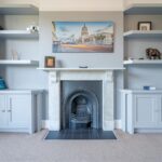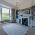 Double glazed sash bay window to front elevation, a feature marble fireplace with cast iron fire inset, central heating radiator, built in storage and shelving with decorative coving and ceiling rose.
