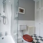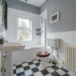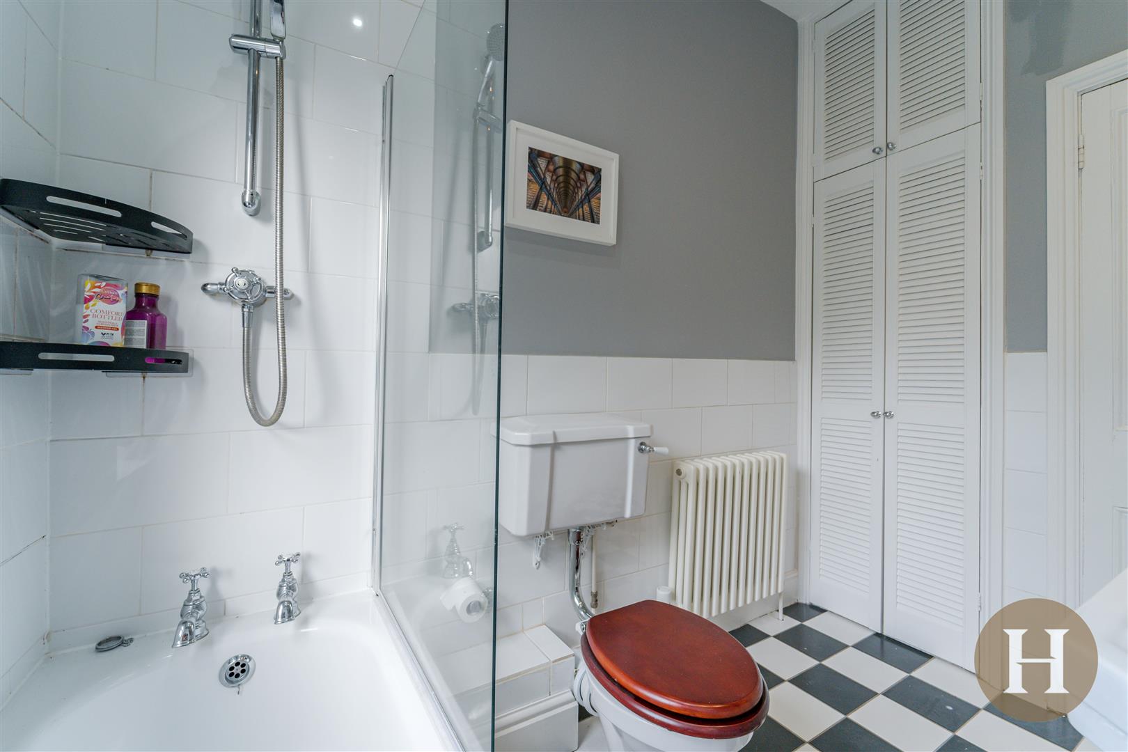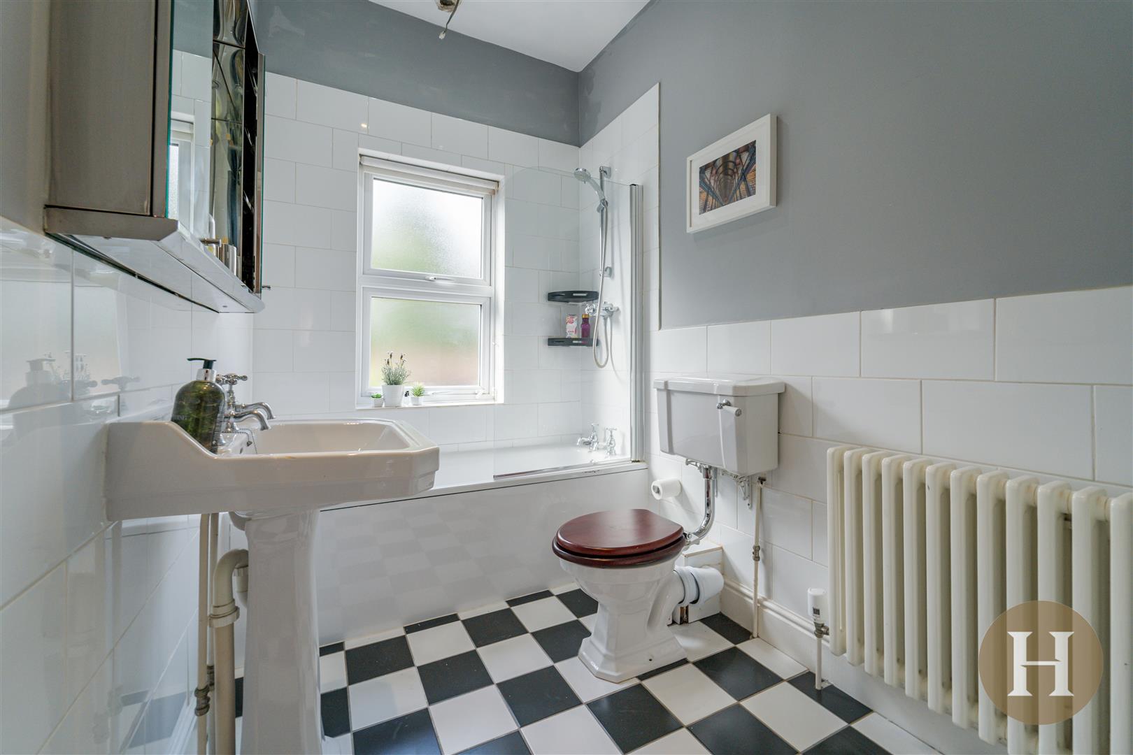 Partially tiled bathroom with double glazed window to rear elevation comprising WC, pedestal wash hand basin, bath with chrome mixer taps and shower above. Traditional style radiator, medicine cabinet and storage cupboard.