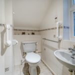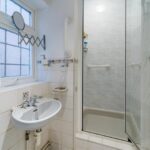 Partially tiled shower room, low level flush WC, hand wash basin and walk in shower cubicle. Opaque glazed window to the side elevation, ceiling light point and shaving point.