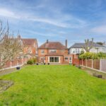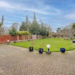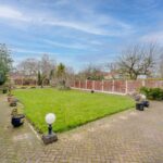 Large private rear garden, predominantly laid to lawn with extensive patio area and further patio area to the rear.
