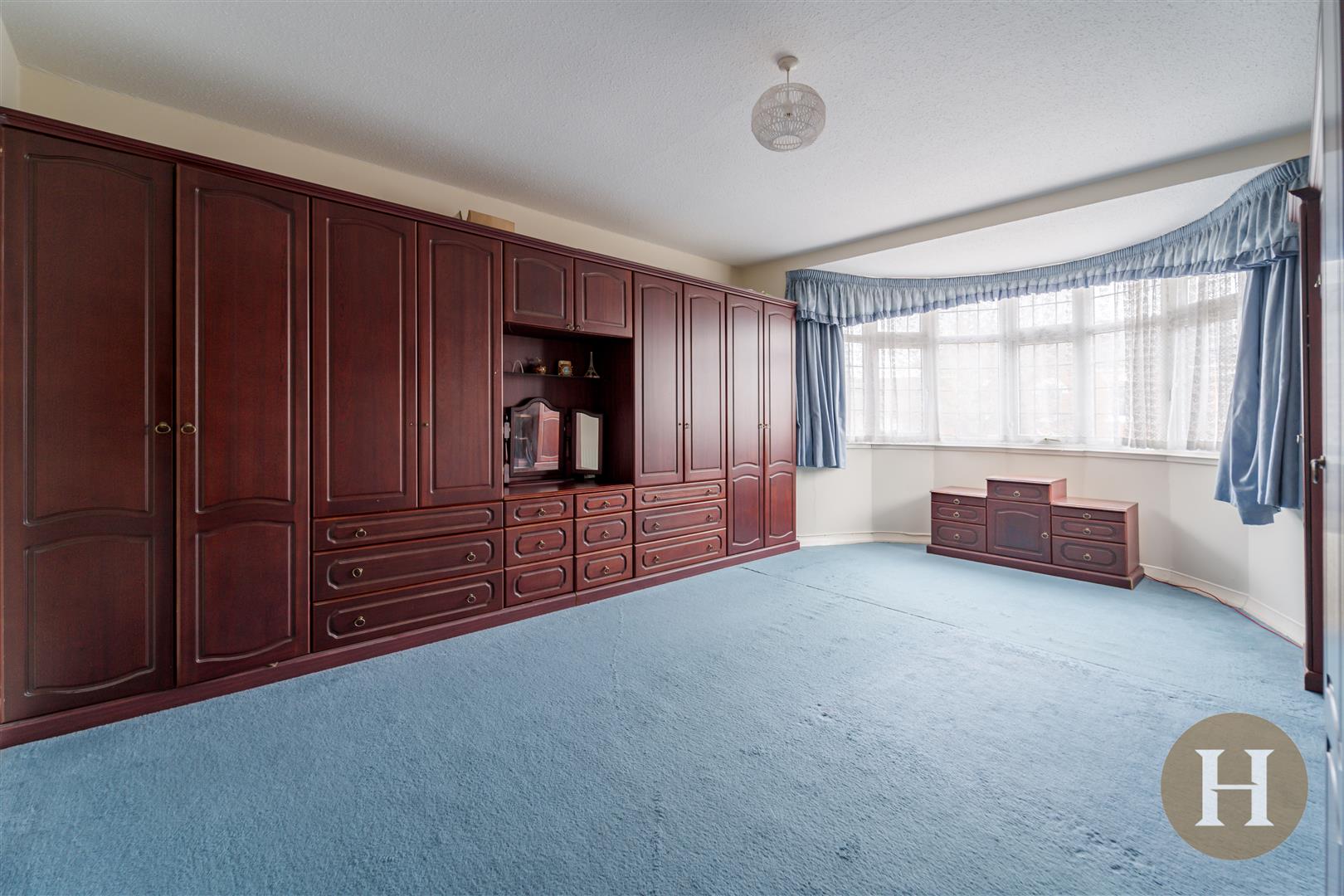 Extensive master bedroom boasting bay window to the front elevation, a range of fitted wardrobes and cabinets. Radiator, ceiling light point and carpeted flooring.