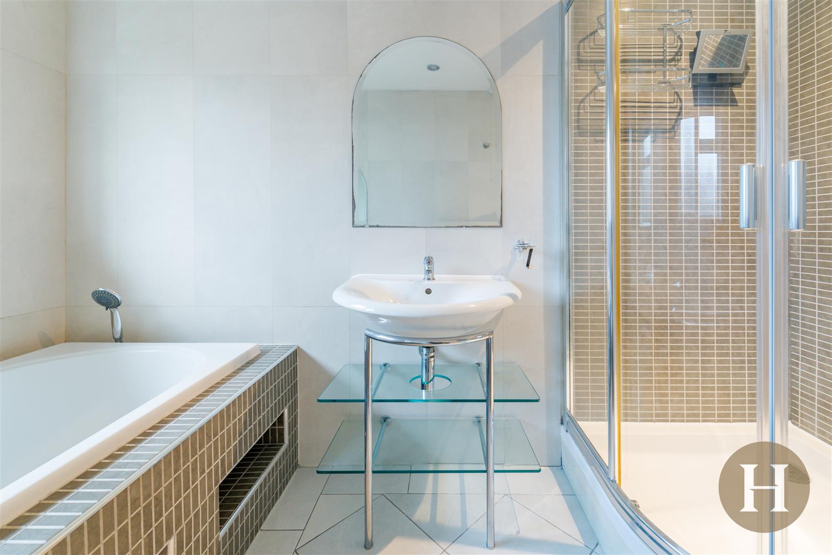 A modern family bathroom complemented by elegant tiling and quality fittings features both a large fitted bath and a separate walk-in shower, catering perfectly to family life.