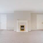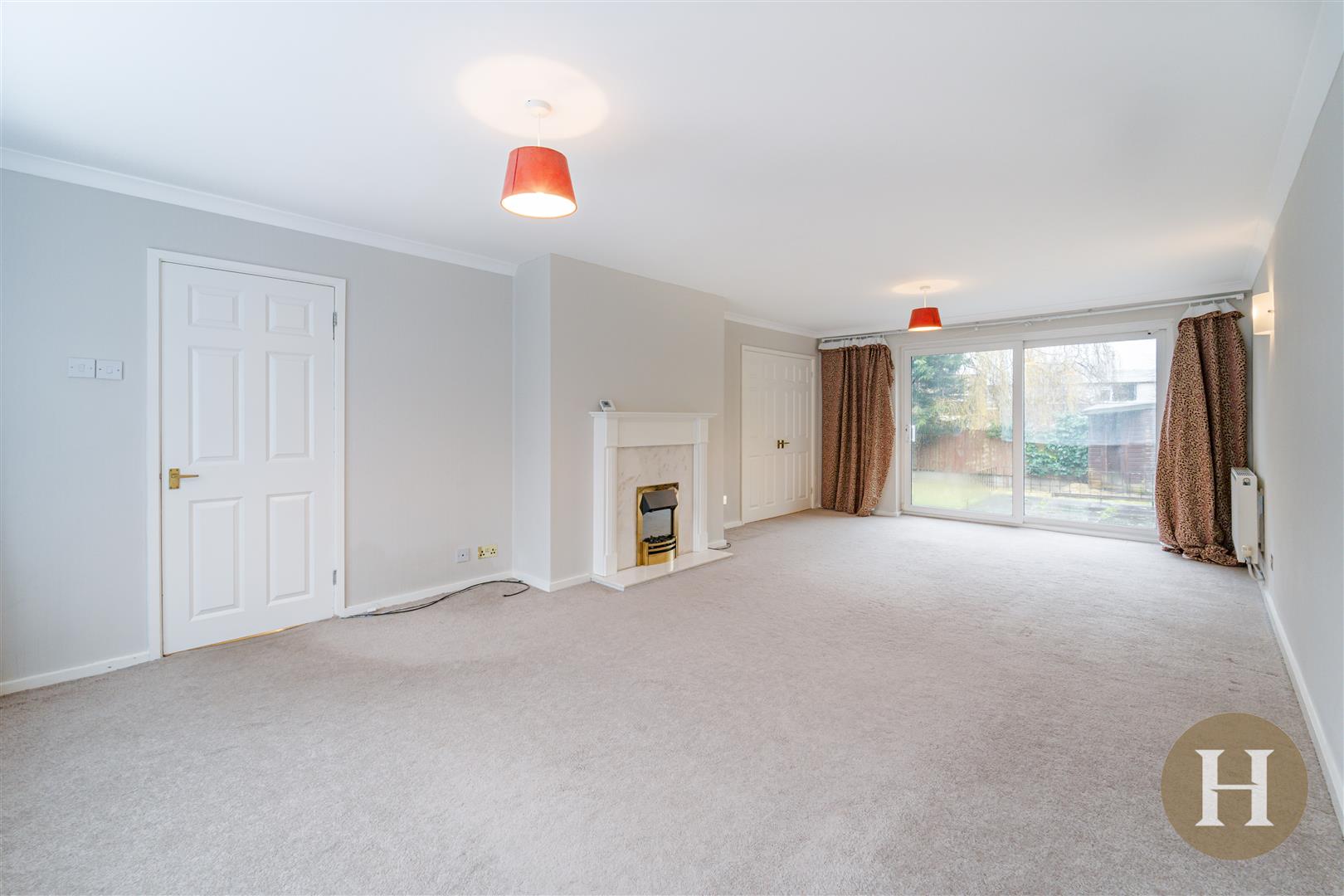 The principal lounge is flooded with natural light and features a charming fireplace along with sliding doors opening onto the rear garden — creating a seamless connection between indoor and outdoor living.