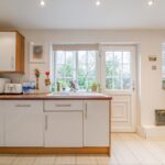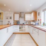 Tiled flooring, ceiling spotlights, gas central heating radiator and plumbing for washing machine. Door and windows to rear elevation, a range of base and wall units with breakfast bar. Integrated dishwasher, sink and drainer unit and fitted cooker with extractor hood.