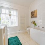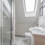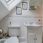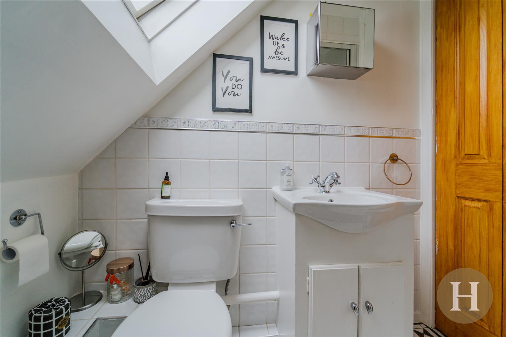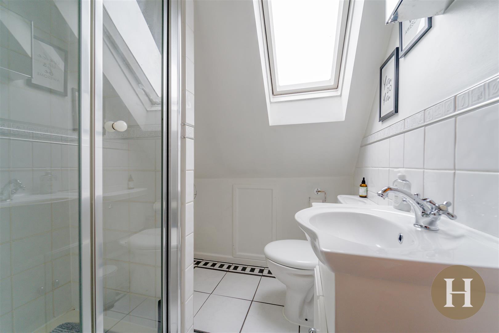 Low level flush WC, vanity unit, tiled flooring and partially tiled walls. Walk in shower cubicle with mains shower, skylight and towel radiator.