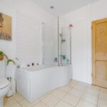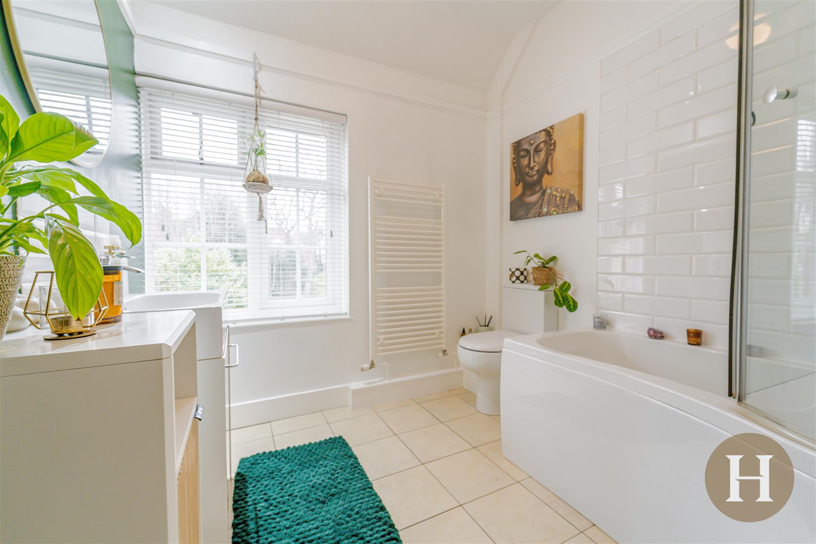 Tiled flooring with partially tiled walls, low level flush WC and vanity unit. Mains shower over P-shaped bath, towel radiator and window to rear elevation.