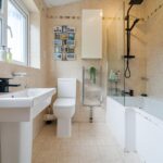 Opaque double glazed window to rear elevation, panelled bath with shower over, wash hand basin, low flush WC, two chrome effect heated towel rails, tiled flooring.