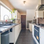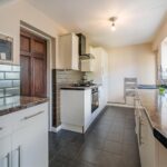 Double glazed window to garden, range of base units surmounted by a roll edge laminate work surface with cupboards over, integrated fridge freezer, oven, hob and extractor hood, chrome effect heated towel rail, tiled flooring, door to utility room.